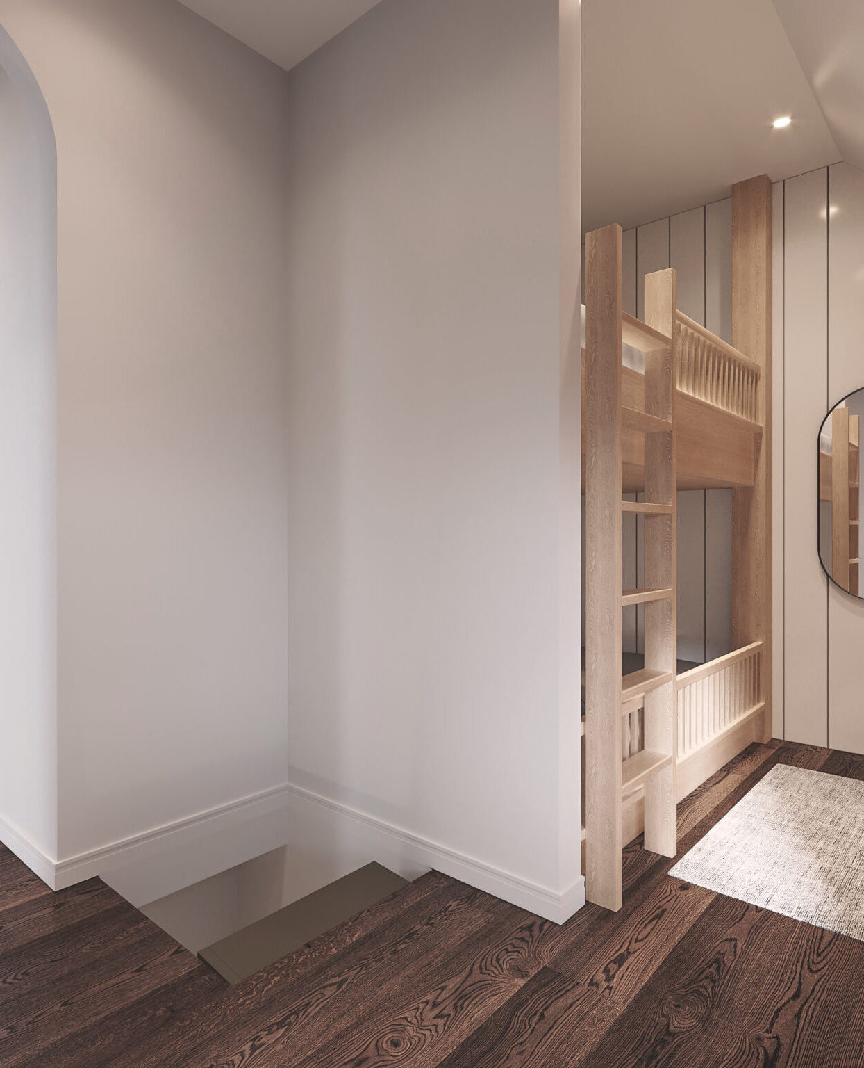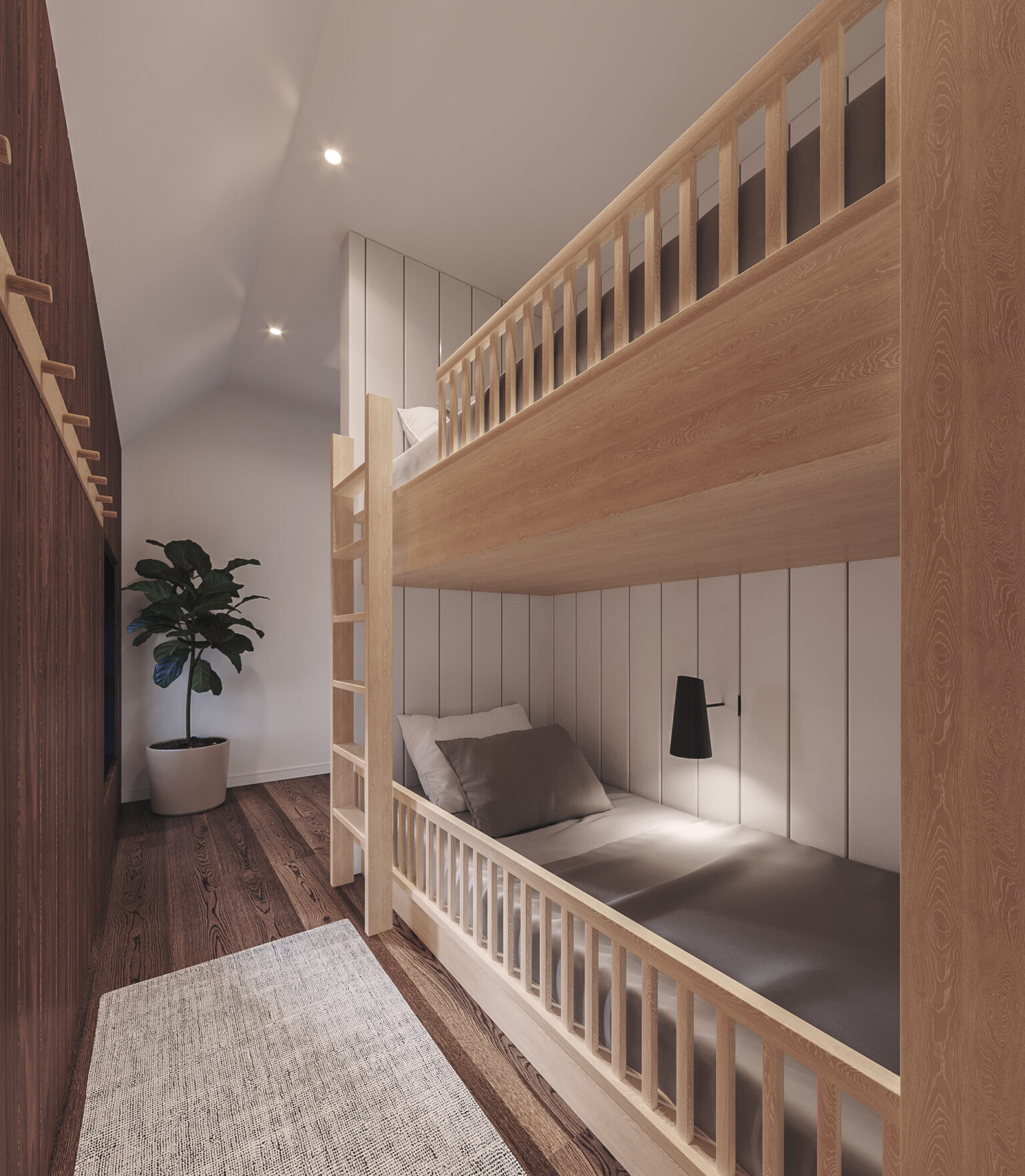 Access to the second floor is done via a ladder which allows to save space while also offering a unique experience for the tenants. On the second floor you will find a very small bathroom, designed lengthwise with a master bedroom that includes a king-sized bed and reading corner. There is also another sleeping area that includes 2 single bunk beds. The sloped ceiling offers a super cozy atmosphere.