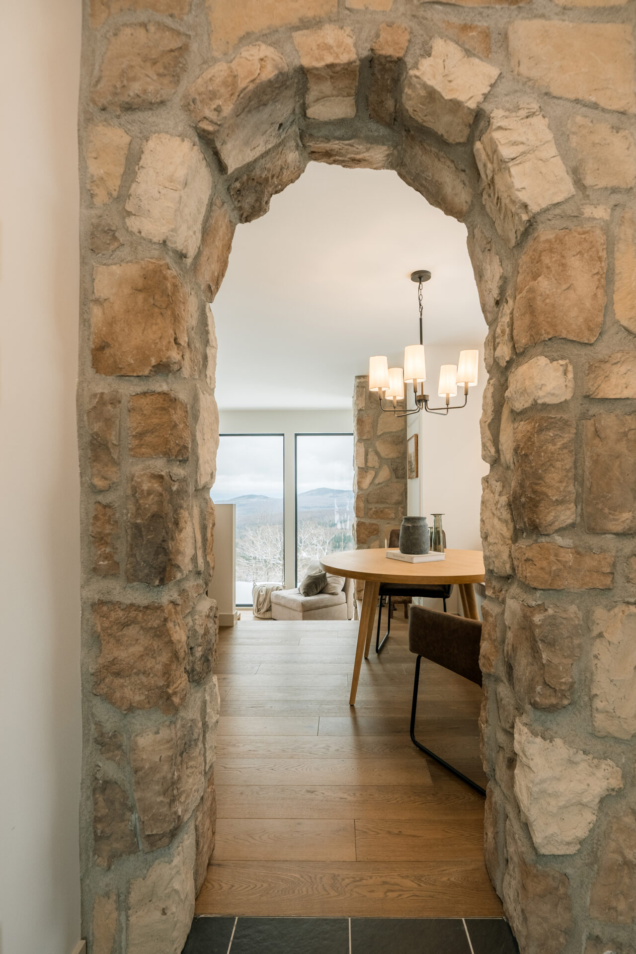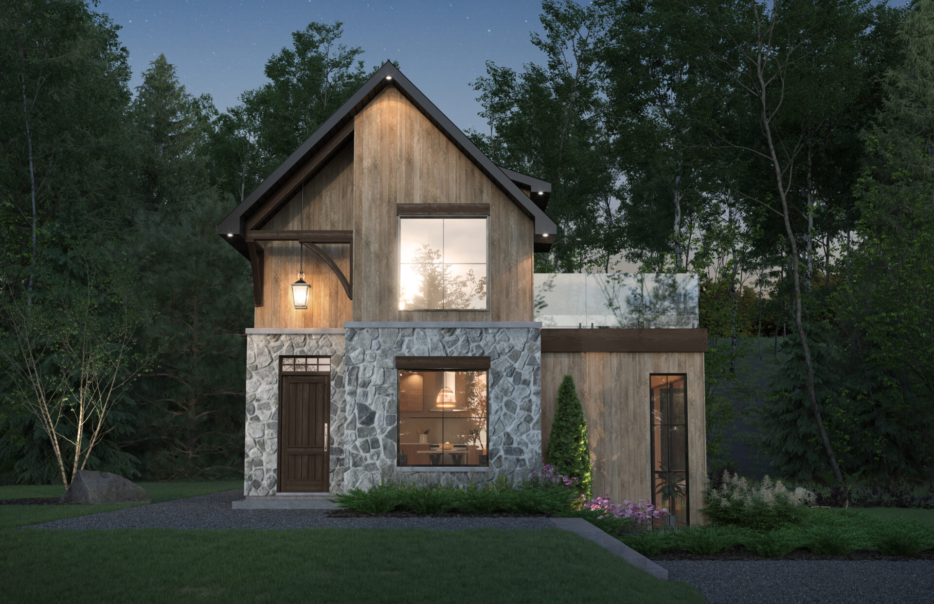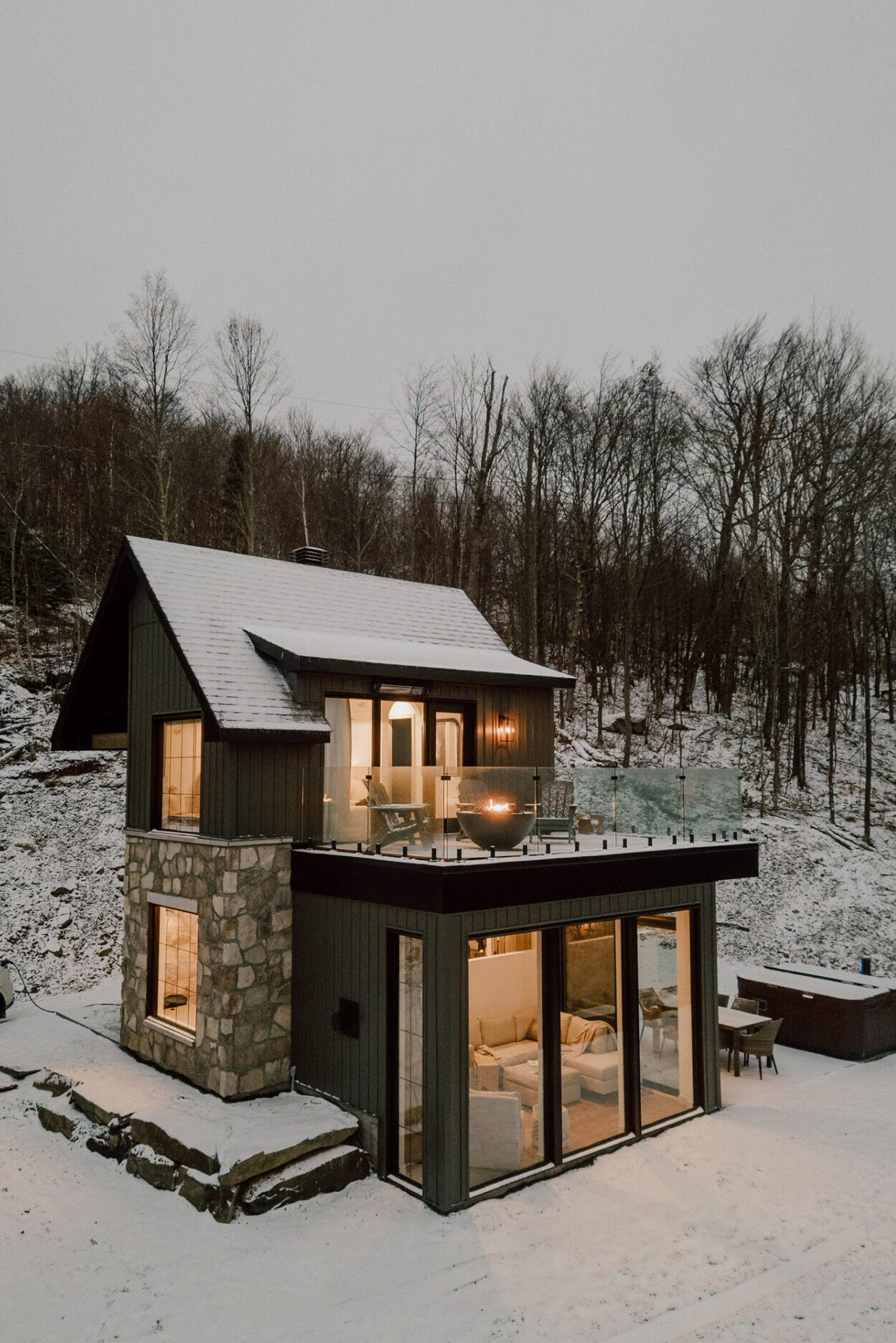 Of course, there are certain elements that cannot be missed in the designs of a recreational cottage and that are also very appreciated such as a fireplace and multiple areas designated for relaxing, such as seating area found in the dining room. Another must would be a spa. This is why the terrace/BBQ section at the back allows you to enjoy the view. The stone wall creates appreciated intimacy from the parking area and you will also see this same stone repeat on the house.