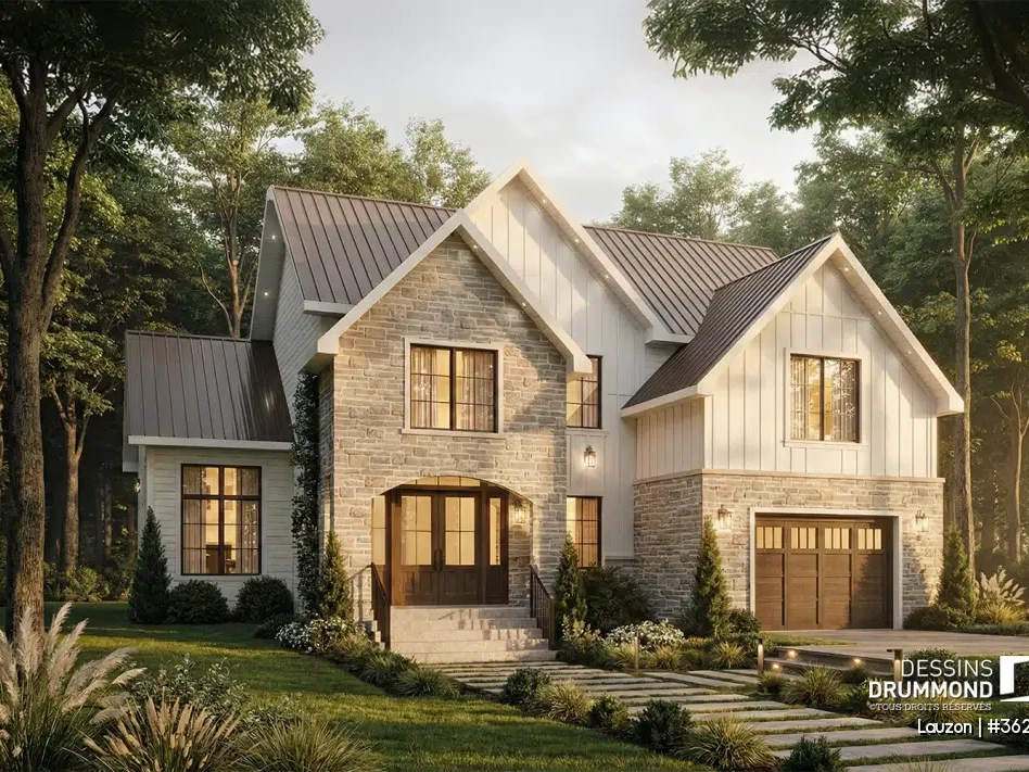 The European house plan Lauzon (#3626) stands out with its elegant architecture and timeless design. Its balanced façade, stone accents, and board and batten siding create refined curb appeal inspired by classic European homes.