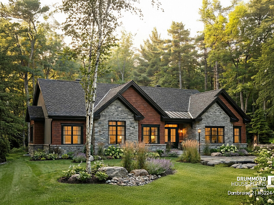 The Dambroise 2 (#3224-V1) is a single-story house plan with double garage that stands out with its modern rustic style and exceptional natural light. With 2,016 sq. ft. on the main floor and a basement of equal size, this model offers outstanding flexibility. Before choosing a house plan, it’s essential to carefully evaluate your lot and your needs.